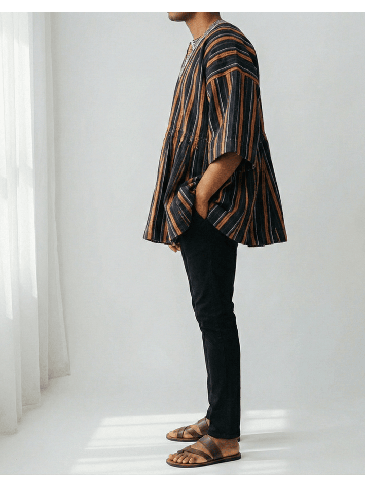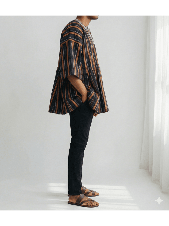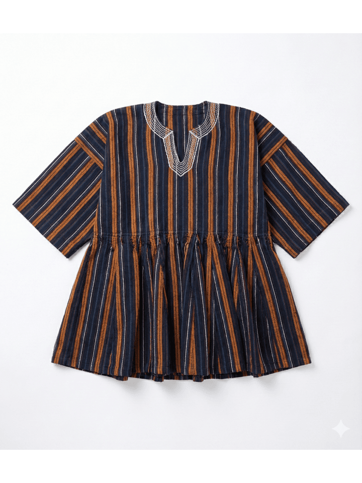 Handcrafted by skilled artisans from Northern Ghana using age-old handloom techniques, this authentic Fugu Smock (also known as Batakari) showcases the region’s signature tightly woven cotton fabric with bold striped patterns. Each smock is uniquely individual, featuring subtle embroidered detailing at the neckline and practical side pockets for everyday ease.