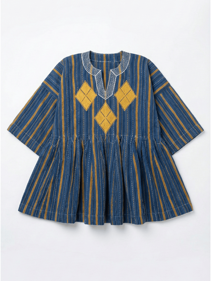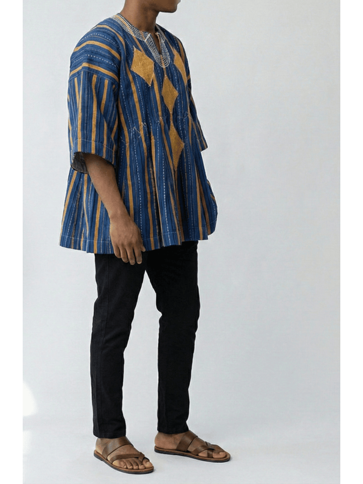 Handcrafted by skilled artisans from Northern Ghana using age-old handloom techniques, this authentic Fugu Smock (also known as Batakari) showcases the region’s signature tightly woven cotton fabric with bold striped patterns. Each smock is uniquely individual, featuring subtle embroidered detailing at the neckline and practical side pockets for everyday ease.