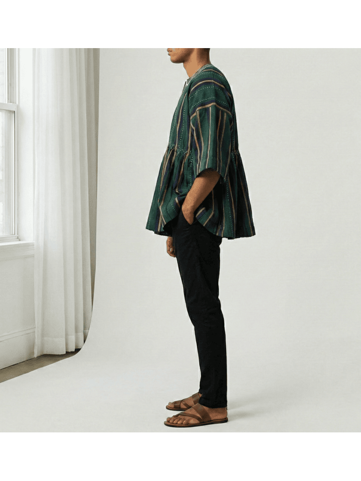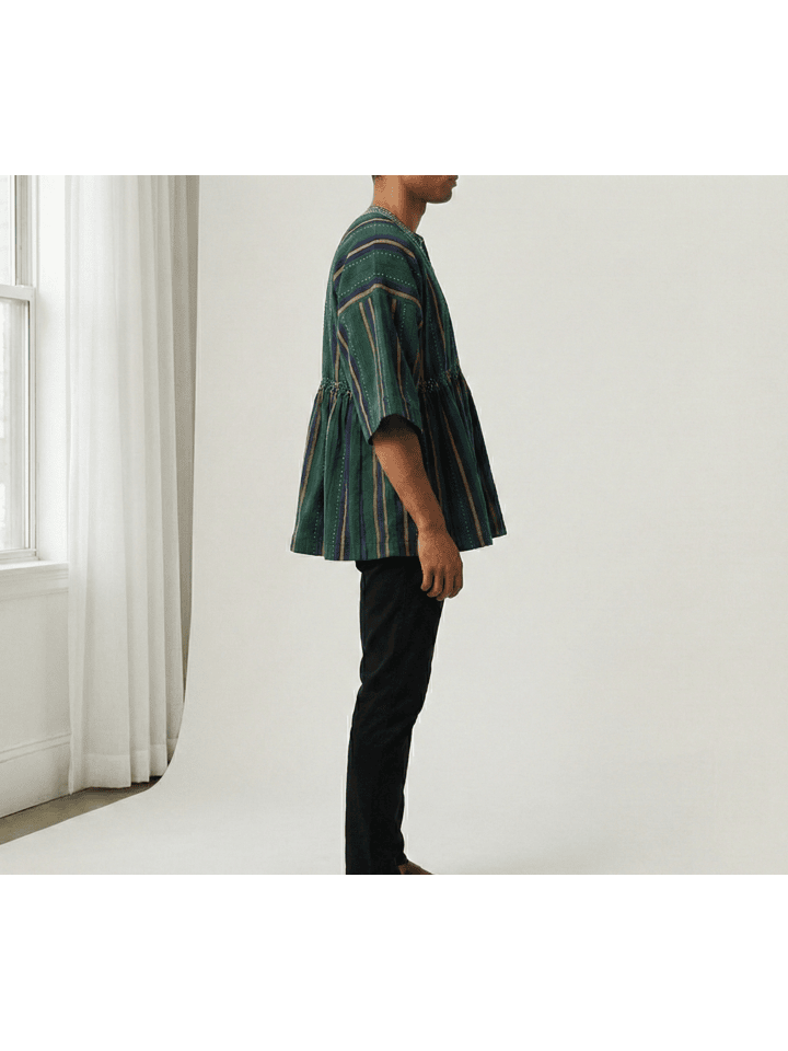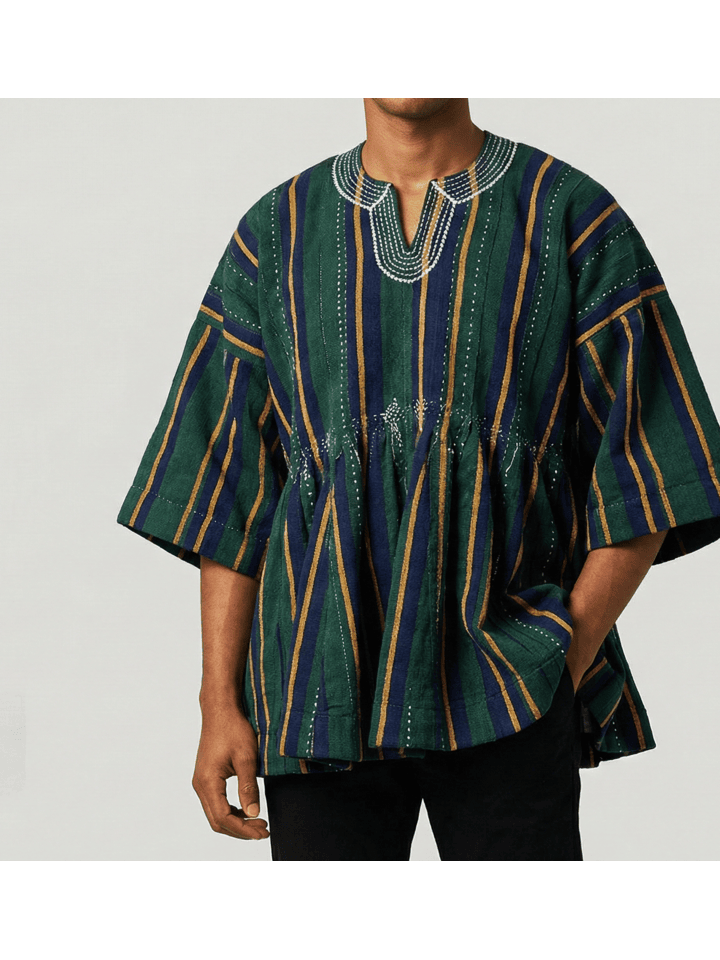 Handcrafted by skilled artisans from Northern Ghana using age-old handloom techniques, this authentic Fugu Smock (also known as Batakari) showcases the region’s signature tightly woven cotton fabric with bold striped patterns. Each smock is uniquely individual, featuring subtle embroidered detailing at the neckline and practical side pockets for everyday ease.