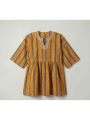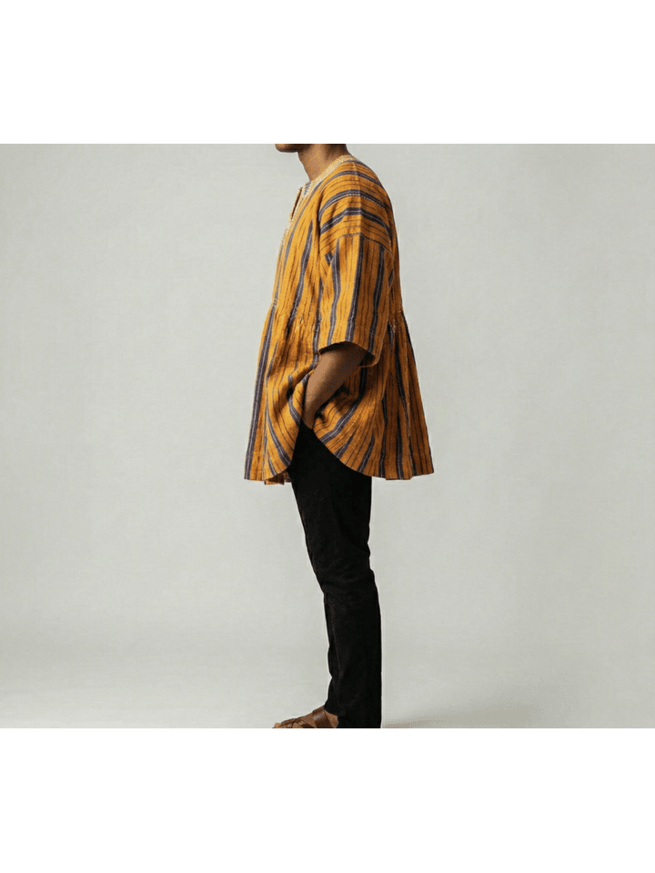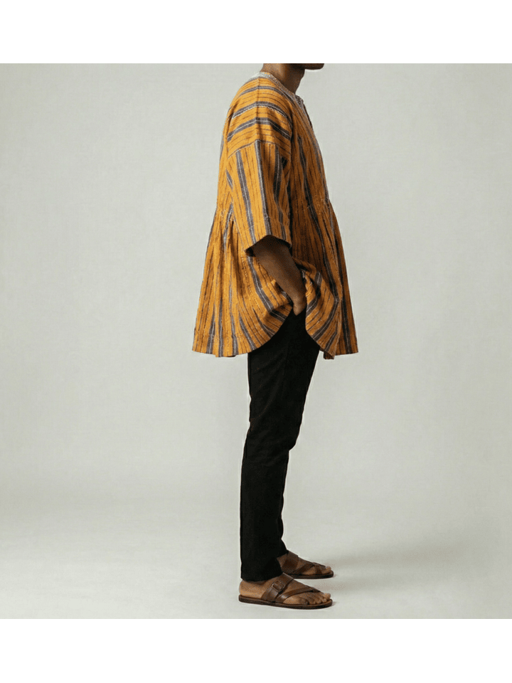 Handcrafted by skilled artisans from Northern Ghana using age-old handloom techniques, this authentic Fugu Smock (also known as Batakari) showcases the region’s signature tightly woven cotton fabric with bold striped patterns. Each smock is uniquely individual, featuring subtle embroidered detailing at the neckline and practical side pockets for everyday ease.